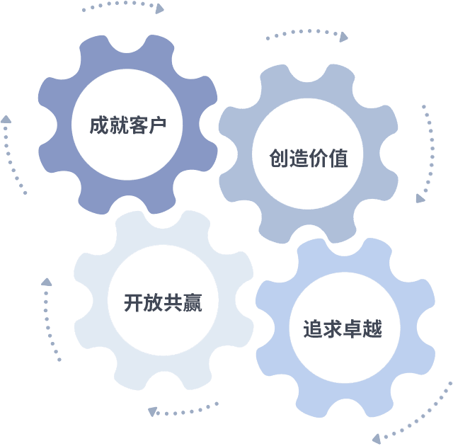 成就客户是一切决策的出发点,,,创造价值是衡量所有工作的标准,,,,追求卓越是我们做事做人的态度,,,,开放共赢是我们的格局也是最终的结果。。价值观的齿轮环环相扣,,,,推动着组织里的每个人不断向前。。。。